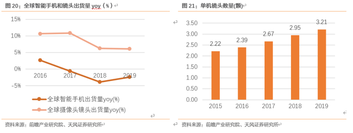 数量:多摄的渗透带来手机镜头出货量增速高于手机行业的成长,摄像头专业化持续拉动数量提升。回顾历史,智能手机经历了导入-成长-成熟期之后,于17年开始进入一个存量市场,全球智能手机出货量17-19年连续三年yoy负增长。然而全球摄像头镜头出货量连续保持正增长,16-19年平均8%。单机搭载镜头数量从15年的2.22颗连续增长至19年3.21颗。具体来看,不同厂商或者不同系列会配置不同的多摄方案主打不同的功能,各个镜头既独立又协同工作,比如超广角:开拓取景范围、潜望式长焦镜头:高倍变焦下保证高成像质量、人像:镜头接近人视野拍照更自然、景深:虚化、电影镜头:提升拍摄体验,从而持续不断地进行摄像头专业化、提升用户的拍照体验。据Frost&Sullivan,单部智能手机搭载的摄像头/镜头数量预计上升至2024年的4.9颗。