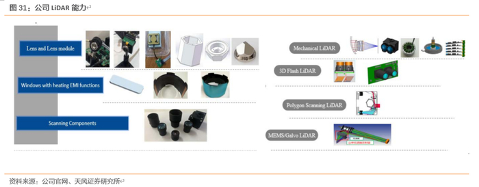 具备一体化LiDAR能力,获得客户量产订单:提供机械式激光、MEMS激光、3D Flash激光、相控阵激光雷达,具备包括玻璃球面/非球面、塑料非球面、柱面镜&非球面柱面镜、外罩、镜头等核心光学零件设计加工经验。截至20H1,公司应用于主流驾驶平台的800万像素车载镜头已经得到主要客户量产许可,此外,还加入Leddar™ 生态系统,LeddarTech® 是一家提供最通用且可扩展的自动驾驶和移动 LiDAR 平台的行业领导者,公司将与LeddarTech以 LeddarEngine™ 为基础,开展针对尖端、前沿 LiDAR 光学器件设计的协作,加速 LiDAR 在高级驾驶辅助系统和自动驾驶应用中的部署。