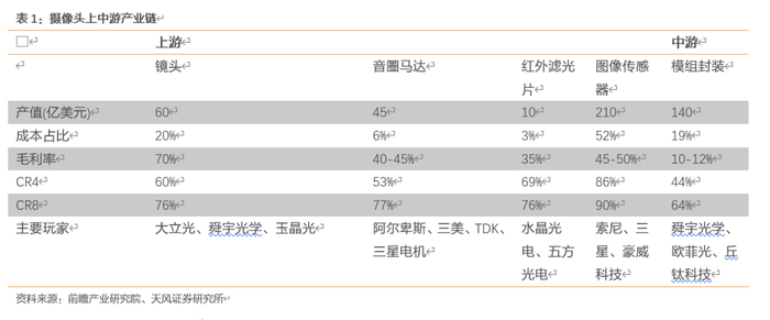 公司所处摄像头上中游产业链环节,镜头&模组联动。摄像头产业链上游零部件主要有镜头、马达、图像传感器、滤光片等;中游是摄像头模组的制造。下游是智能手机、平板电脑、笔记本电脑、PC,覆盖视频会议、视频监控、车载、工业、娱乐、医疗等应用领域。从摄像头产业链来看,各环节产值、价值量、成本、毛利率、竞争格局受到供需、技术壁垒的影响而有差异。