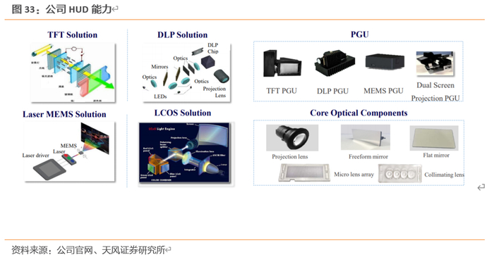 公司HUD能力&业务进展:具备一体化能力,AR HUD已给客户送样。公司提供combiner、斜向式、反射式、AR HUD多种HUD解决方案,拥有专业的光学研发团队和具备强大的光学设计加工能力,能量产多种核心光学零件,包括投影镜头、自有曲面镜、准直透镜、复眼透镜、平面反射镜。截至19年,公司AR HUD已经给客户送样。