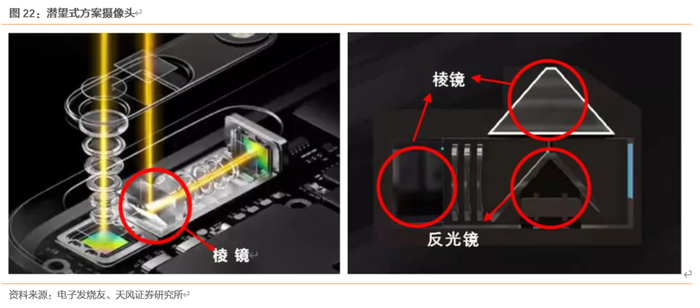3) 潜望式方案支持高倍率光学变焦,价格高于普通长焦镜头+下沉持续放量:潜望式方案是通过折射棱镜改变光路、大幅增加实际拍摄焦距、实现高倍率光学变焦的方案,具体是通过增加折射镜的方式,实现光路90°转变,使得镜头横向放置(不增加模组厚度),同样透镜数量的潜望式镜头因为增加了棱镜比普通的长焦镜头ASP要高,单个潜望镜头成本约20-30美元。从量上看,20年全球搭载潜望式镜头的智能手机出货量将达到 8300 万部,yoy+400%,有望在21年突破4亿部。