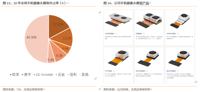 协同发展,镜头+模组齐发力:全球手机摄像头模组竞争格局较为集中,19年CR5=50.7%.,CR10=72.7%,公司全球市占率为13.2%,排名第二,仅次于欧菲17.2%。公司与03年开始切入摄像头模组领域,致力于镜头与模组协同发展,目前公司模组产品种类全,旗下产品包括光学变焦、双摄、光学防抖、PDAF、自动对焦、固定对焦模组等。