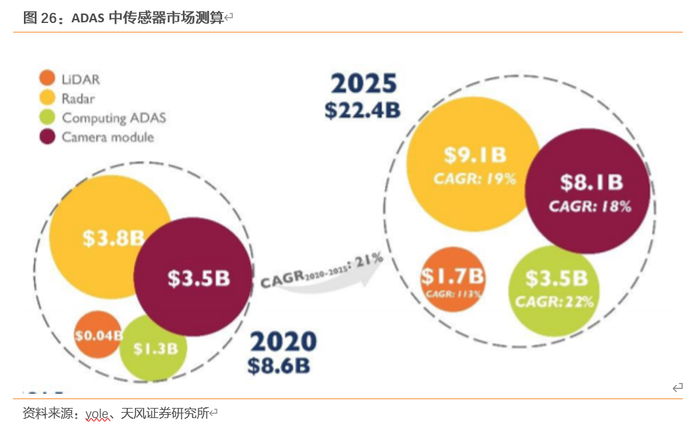 ADAS打开从成像到感知传感器的市场空间:雷达、摄像头等。ADAS是指利用安装在车辆上的传感、通信、决策及执行等装置,实时监测驾驶员、车辆及其行驶环境,并通过信息和/或运动控制等方式辅助驾驶员执行驾驶任务或主动避免/减轻碰撞危害的各类系统的总称,按功能可分为预警类、主动控制类和其他辅助性。从硬件架构上来看,ADAS主要分为环境感知、计算分析、执行控制,从感知层面来看,ADAS使用的传感器包括超声波雷达、毫米波雷达、摄像头等。随着ADAS持续渗透,感知层面各传感器市场空间打开,据yole,预计2025年,雷达、激光雷达、摄像头模组市场空间达到91、17、81亿美元,20-25年的复合增长率分别为19%、114%、18%。