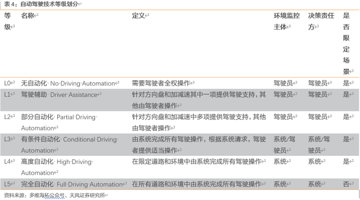 自动驾驶分为L2-L3高级辅助驾驶以及L4/L5无人驾驶级别。据SAE. 自动驾驶可为从L0级(纯由驾驶员控制)至L5级(完全自动驾驶)6个级别,级别越高,车辆的自动化程度越高,动态行驶过程中对驾驶员的参与度需求越低,对车载传感器组成的环境感知系统的依赖性也越强。L3级是自动驾驶等级中的分水岭,其驾驶责任的界定最为复杂:在自动驾驶功能开启的场景中,环境监控主体从驾驶员变成了传感器系统,驾驶决策责任方由驾驶员过渡到了汽车系统。L2/L3级自动驾驶功能通常被定义为高级辅助驾驶,L4/L5级为无人驾驶应用。
