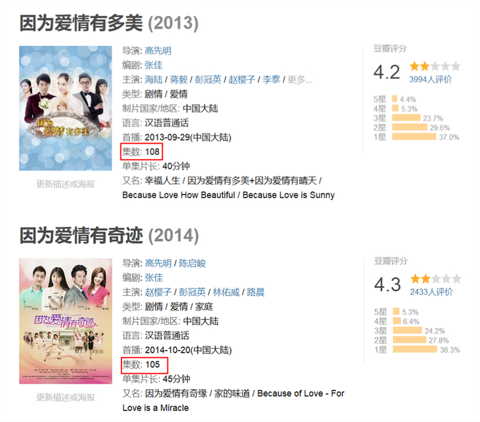 很多年轻观众没看过“因为爱情”系列,但它们播出时都获得极高的收视率,尤其是《因为爱情有奇迹》,当时全国网收视率连续多日破4%,颇受大妈观众的认可。