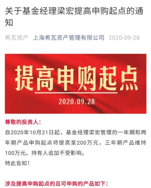 基金君也发现,2020年9月希瓦资产也公告,提高部分产品的申购起点,从2020年10月21日起,基金经理梁宏管理的一年期和两年期产品申购起点将提高至200万元,三年期产品维持100万元。