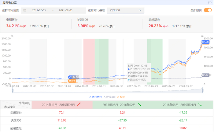 统计个股、基准与超越基准的年化和累计收益率,可帮助投资者将个股与基准收益率做对比从而判断个股的投资价值。