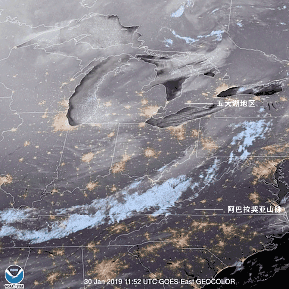 这个时候就看出阿巴拉契亚山脉的作用了(2019年1月寒潮南下)(图:NOAA)▼