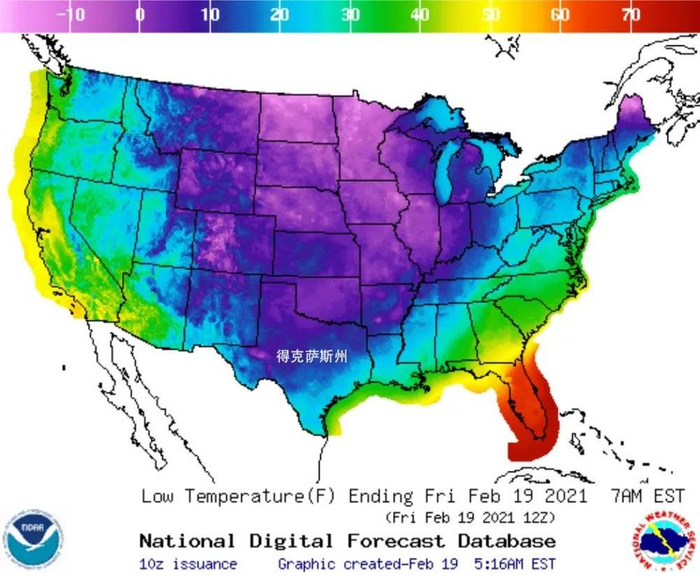 2月19日早晨的低温美国,图中温度应为华氏度,1华氏度相当于-17.22摄氏度,-10华氏度,相当于-23摄氏度,相当冷了(图:NOAA)▼