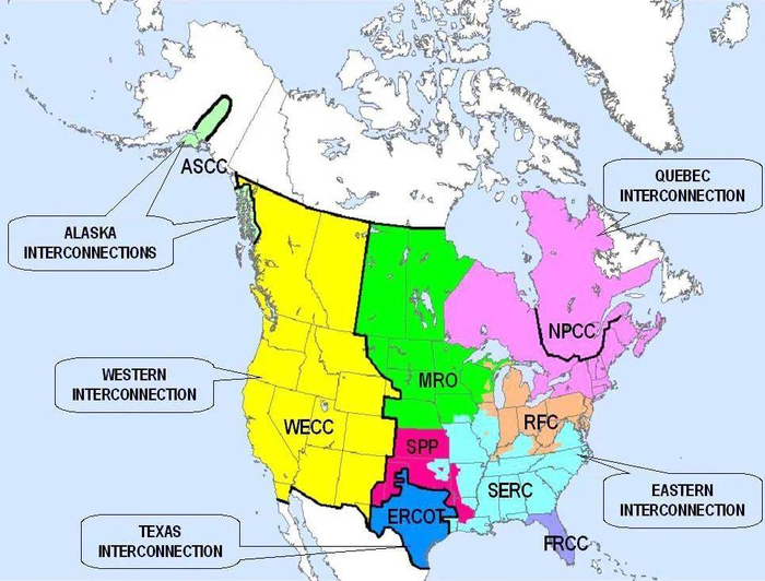 除了这三个外,北美还有阿拉斯加电网和魁北克电网,最大的是东部和西部(图:wikipedia)▼