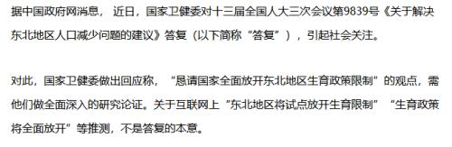 不过,关于这个问题,国家卫健委最新给出的回应,却是:“东北将试点放开生育限制”等推测不是本意。
