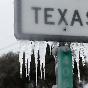 当地时间2021年2月18日,美国得州,路牌上挂着冰柱。