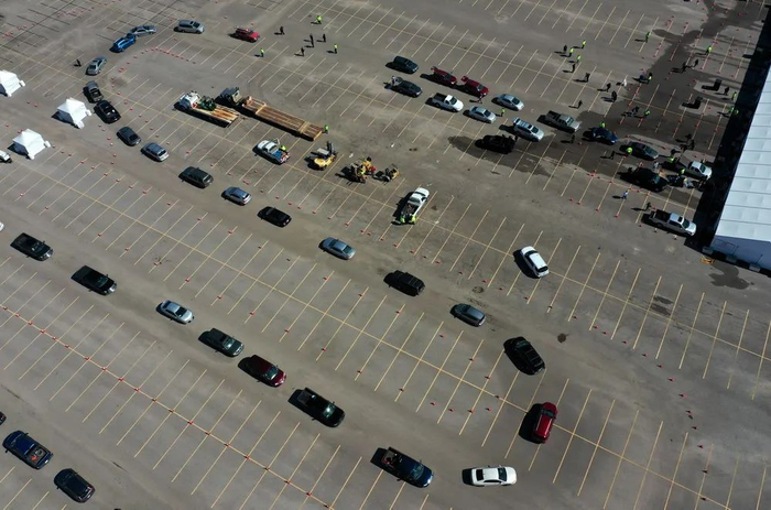 当地时间2021年2月19日,美国得州休斯顿市,汽车排成蛇形队伍,人们等待领取免费饮用水。