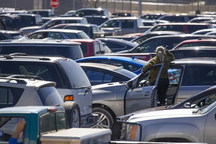 当地时间2021年2月20日,美国得州奥斯汀市,私家车排长队领取免费食品。