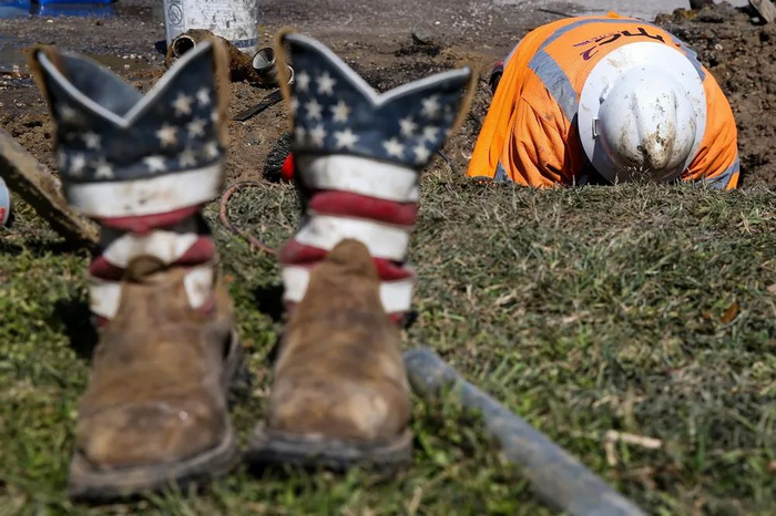 当地时间2021年2月19日,美国得州加尔维斯顿市,工人在维修水管。