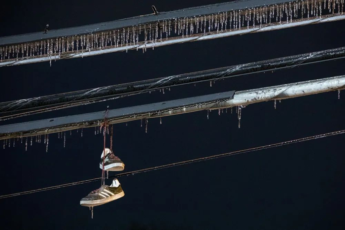 当地时间2021年2月17日,美国得州奥斯汀市,电线上挂着冰柱。