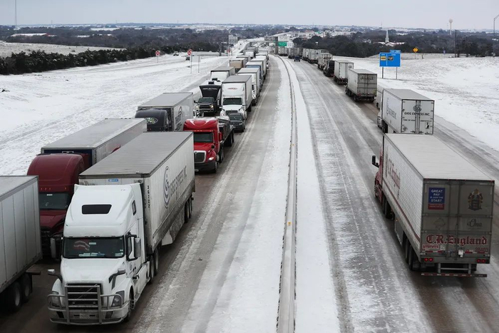 当地时间2021年2月18日,美国得州基林市35号州际公路上,一望无际的车辆在冰雪中排着长队等待通行。