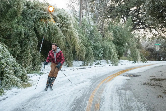 当地时间2021年2月18日,美国得州奥斯汀市,市民在路上滑雪。
