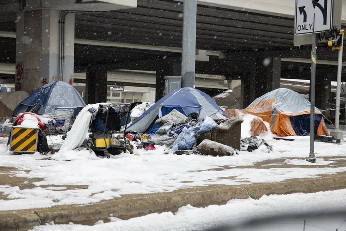 当地时间2021年2月18日,美国290E州际公路下,流浪者的帐篷被暴雪覆盖。