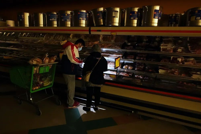 当地时间2021年2月16日,美国得州达拉斯市,民众在漆黑的超市内,借助手机灯光查看肉类柜台。
