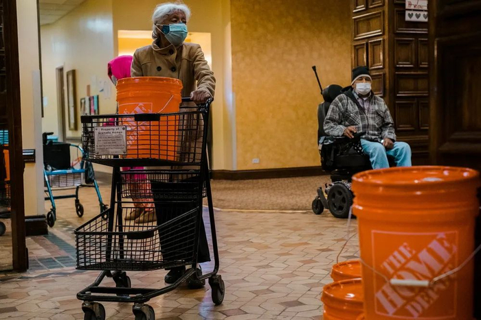 当地时间2021年2月18日,美国得州圣安东尼奥市,一处老年公寓内,老人打水准备洗澡。该建筑物虽然电力已经恢复,但供水尚未解决。