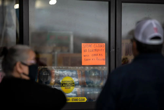当地时间2021年2月17日,美国得州奥斯汀市,一家超市门口张贴着暂停营业的公告,人们依然在等待开门。