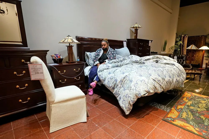 当地时间2021年2月17日,美国得州休斯顿市,Taylor Brown在一家具店过夜。严寒天气中,大量当地居民不得不前往有暖气的避难所过夜。