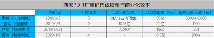 从PD-1产品的获批时间来看,君实生物特瑞普利最早获批,但2019&2020年销量落后于恒瑞和信达,这与公司商业化能力不足有密切关系。