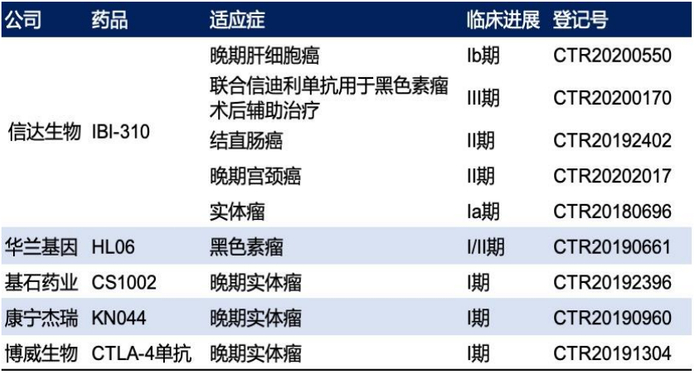 ● CTLA-4靶点:CTLA-4是最重要的免疫检查点之一,BMS的Yervoy伊匹木单抗在2019年销售额已接近15亿美元,国内目前尚无国产抑制剂获批,信达生物的IBI-310是目前国内临床进度最靠前的。