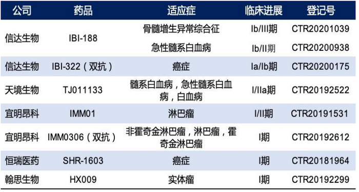 ● CD47靶点:信达生物针对CD47靶点,开发出三款抗体管线(单一疗法IBI-188、双抗IBI-322、一款从Alector引进),从国内相关竞争对手进度看,信达生物进度走在前列。