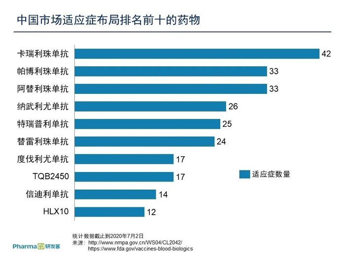 据研发客数据,截至2020年7月中国市场适应症排名前十的药品中,4个PD-1品种都位列其中,其中恒瑞卡瑞利珠以42个适应症一骑绝尘。君实、百济和信达分别以25个、24个和14个适应症分列第5、第6和第9位。