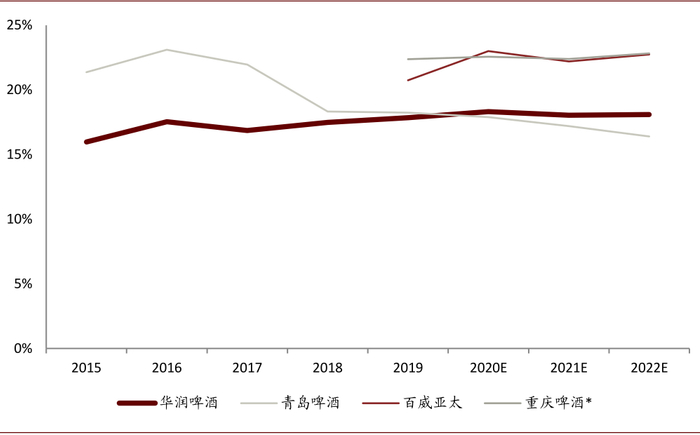 我们认为高端市场竞争正在明显加大,去年底华润啤酒显著加大渠道费用投放(主要在喜力品牌)或是个信号,且高端费用投放有进一步向单品聚焦趋势。近年龙头公司市场费用投放显著向高端倾斜,且高端费用投放弹性较大,加之随着龙头高端产能较快提升,我们预计高端竞争或会明显加大,因此与市场预期不同,我们认为华润、青啤和嘉士伯中国(重庆啤酒)的销售费用率仍将呈现缓慢上行态势,百威或也将加大综合渠道费用投放力度。