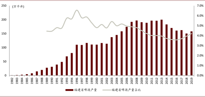 根据我们测算,历年福建省产量基本稳定在全国占比的4-6%,因此我们认为研究福建的啤酒市场演变具备一定的参考意义。