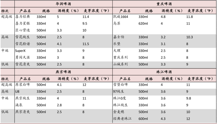 6元以上中高端和高端市场,小瓶化、高浓度为特征。福建市场6元以上占比约为20%,但根据我们实地调研发现,6元以上产品基本为精致小瓶装(250ml以下),且175/207ml等极小瓶型多见,则若换算成正常500ml规格,则相当于此市场零售价在12元以上产品销量占比达到20%。同时,高端小瓶酒酒精浓度/麦芽浓度基本都在4/10度以上,较全国范围内的3/8度浓度,福建高端市场高浓度特征更为明显。