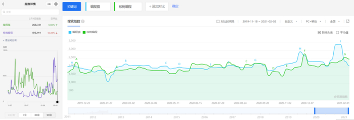 由于投放力度很大,又有张泉灵、蒋昌建等名人代言,编程猫始终是少儿编程教育赛道知名度最高的企业。但目前,此地位正在经受挑战。无论是微信指数还是百度指数,另一家机构“核桃编程”的搜索度和影响力,都在对编程猫形成反超的势头。