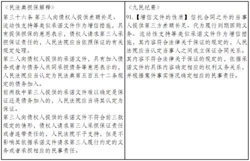 信托业务中,由第三人提供差额补足、流动性支持等类似承诺文件作为增信措施的情形非常普遍。根据《民法典担保解释》的规定,上述增信措施根据是否“具有担保的意思表示”或“具有加入债务或者与债务人共同承担债务等意思表示”,而分别按照保证或债务加入的有关规定进行处理,对于难以确定的,则按照保证处理。