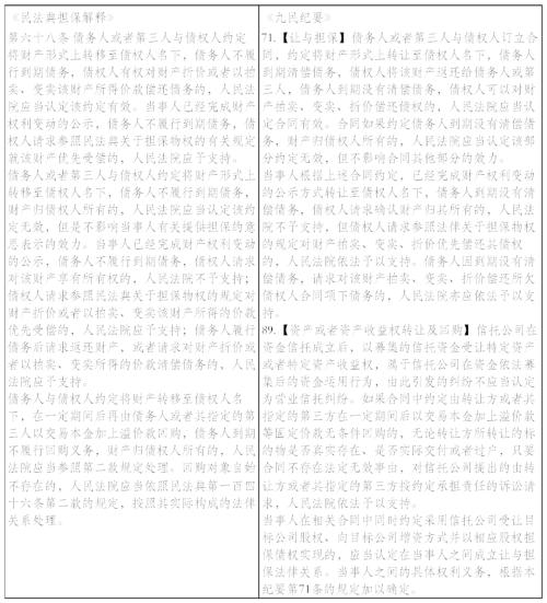 《民法典担保解释》第68条第2款的规定为“当事人已经完成财产权利变动的公示,债务人不履行到期债务,债权人请求对该财产享有所有权的,人民法院不予支持;债权人请求参照民法典关于担保物权的规定对财产折价或者以拍卖、变卖该财产所得的价款优先受偿的,人民法院应予支持”。《民法典》第146条第2款规定为“以虚假的意思表示隐藏的民事法律行为的效力,依照有关法律规定处理。”