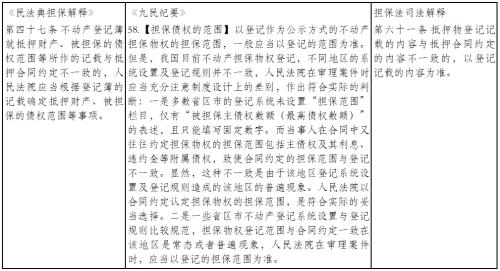 《九民纪要》中关于担保物权的登记,结合我国实际情况,规定对于省区市登记系统未设置担保范围,导致担保范围与登记不一致的情况下,应当以合同认定担保范围,相较而言,属于较为贴合交易现实的裁判指引;但是《民法典担保解释》沿袭了担保法司法解释的规定,彻底按照登记为准,贯彻物权“公示”原则符合物权法基本原理,但这有可能会造成相关案件采取“一刀切”的形式,严重忽视了我国目前不动产担保物权登记,不同地区的系统设置及登记规则并不一致,因各地区制度设计上的差别,所作出的抵押登记并不完全符合交易实际的现实需求。虽然《民法典担保解释》也规定若是因登记机构过错导致当事人不能办理抵押登记的,则登记机关需要承担赔偿责任,但这无疑增加了当事人之间的交易成本。