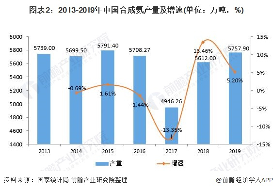 2013-2016年间,我国合成氨行业产量波动幅度较小,一直在5000万吨左右波动。2017年合成氨产量为4946.26万吨,下降幅度达13.35%。2018年我国累计合成氨产量5612万吨,同比上升13.46%。2019年我国合成氨产量5757.9万吨,同比增长5.2%。