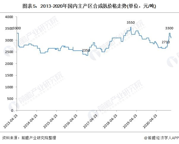 2013-2020年,合成氨价格波动变化,但整体波动不大,2017年到达阶段低点2350元/吨,2018年到达阶段高点3550元/吨。