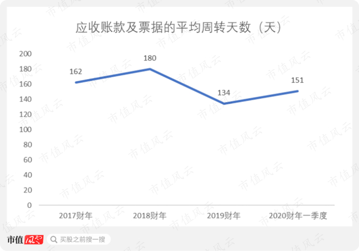 2017财年至2020财年一季度,应收账款及票据的平均周转天数从162天下降到151天,公司回款效率还是略有提高的。