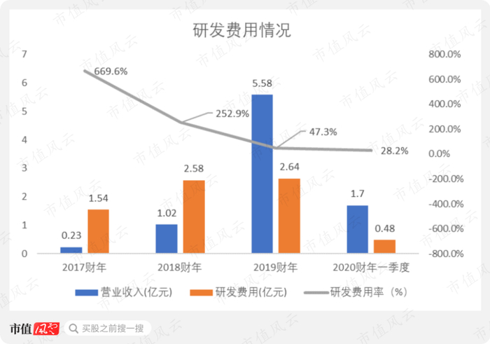 比如2017、2018财年,研发费用率就分别达到669.6%和252.9%。随着公司收入的增长,研发费用率终于降至2019财年的47.3%,只要未来的收入增长速度快于研发费用增长速度,研发费用率还会进一步降低。