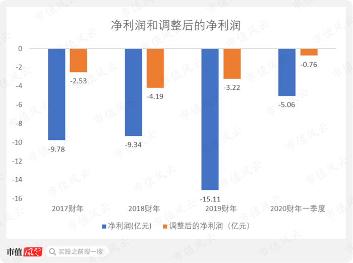 2017财年至2020财年一季度,医渡科技均呈现净亏损的状态,尽管公司的负债端有很多的可转换可赎回优先股,但经调整之后,公司每个财年依然是净亏损的。