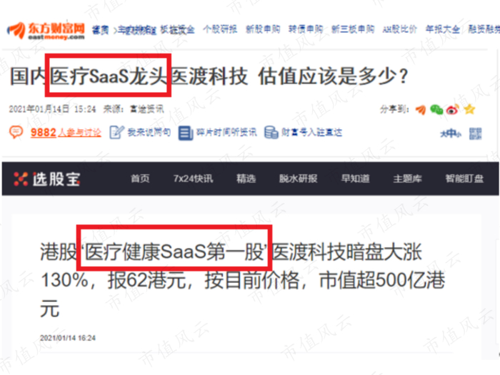 还有的说医渡科技是“医疗健康SaaS第一股”、“医疗健康SaaS排名第一,干就完了!”等。