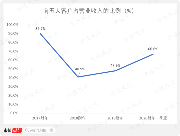 医渡科技的客户集中度较高,前五大客户占营业收入的比例在2017财年已经接近90%,在下降到2018财年的40.9%之后,又开始呈上升的趋势。