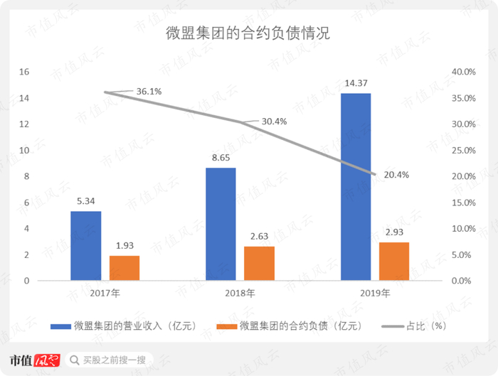 作为对比,微盟集团合约负债的变动就显得有规律得多,微盟集团的财报显示,微盟集团合约负债从2017年的1.93亿元增长至2019年的2.93亿元,其占营业收入的比例从2017年的36.1%下降至2019年的20.4%。