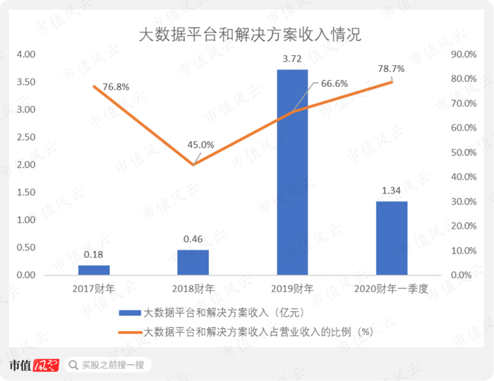 大数据平台和解决方案一直是公司最大的收入板块,该板块收入占营业收入的比例从2017财年的76.8%下降至2018财年的45%,后又逐渐上升至2020财年一季度的78.7%。