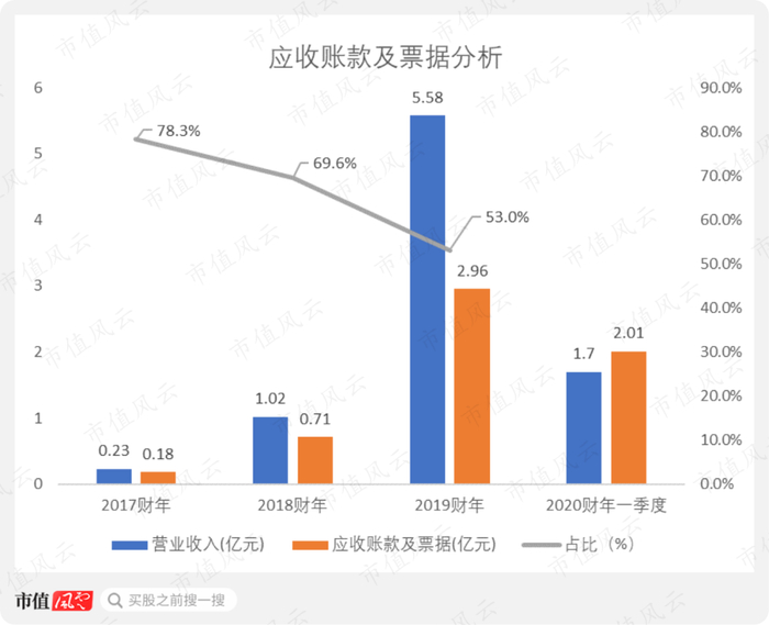 2017财年至2019财年,医渡科技的应收账款及票据(包括合同资产)从0.18亿元增长至2.96亿元,占同期营业收入的比例从78.3%下降至53%,虽然比例下降了,但还是超过了50%。