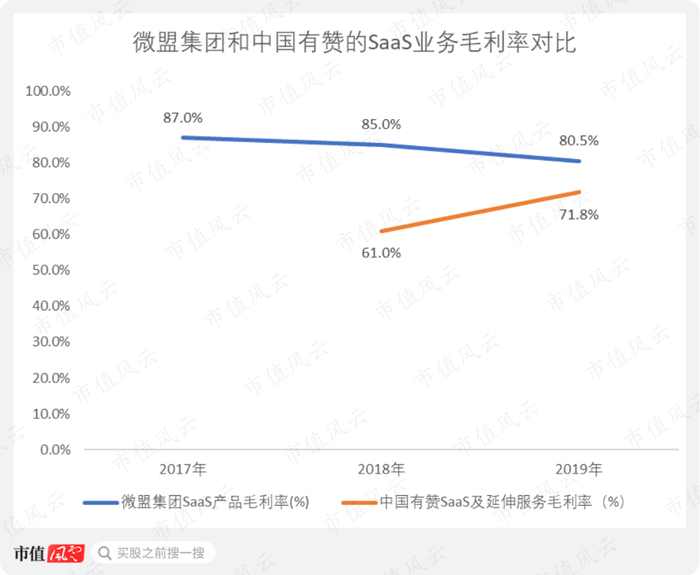 2017-2019年,微盟集团SaaS产品的毛利率一直保持在80%以上,中国有赞的SaaS及延伸服务的毛利率在2018和2019年分别达到61%和71.8%。