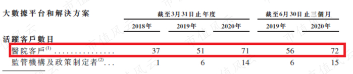 2017财年-2020财年一季度,医渡科技的医院客户数从37个增长至72个,而同期监管机构客户数则从1个增长至15个,从绝对数量上看,医院是公司主要的客户。